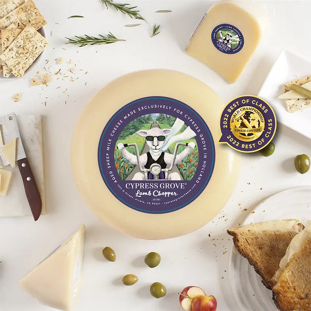 Lamb Chopper by Cypress Grove is a smooth, creamy sheep’s milk cheese with a mild, buttery flavor and subtle tang. Its firm yet supple texture makes it perfect for snacking, melting, or adding a unique touch to cheese boards.